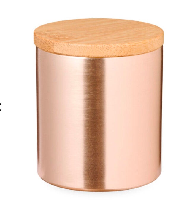Vanille geurkaars. Gepresenteerd in een metalen pot met een deksel van bamboe. Pot verkrijgbaar in een breed scala aan kleuren, met metalen afwerking. Individueel gepresenteerd in een kraftdoosje.