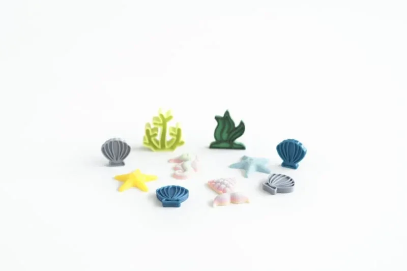 2x verschillende kleuren zeesterren, 1x zeemeerminstaart, 1x zeepaardje, 1x koraal, 1x zeewier, 4x mini schepje (2-3cm). Kleuren van de items kunnen per zakje verschillen.