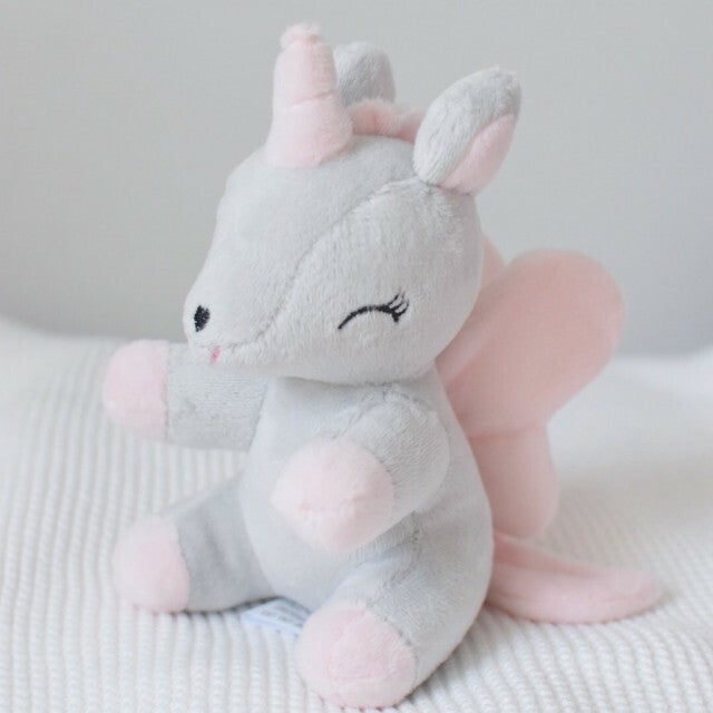 De eenhoorns in fabelachtige pastelkleuren zullen snel een favoriete knuffel worden voor de komende jaren. Zacht en knuffelig, vleugels en een hartvormige teen en "lachende" ogen zijn de kenmerken van deze mascotte.