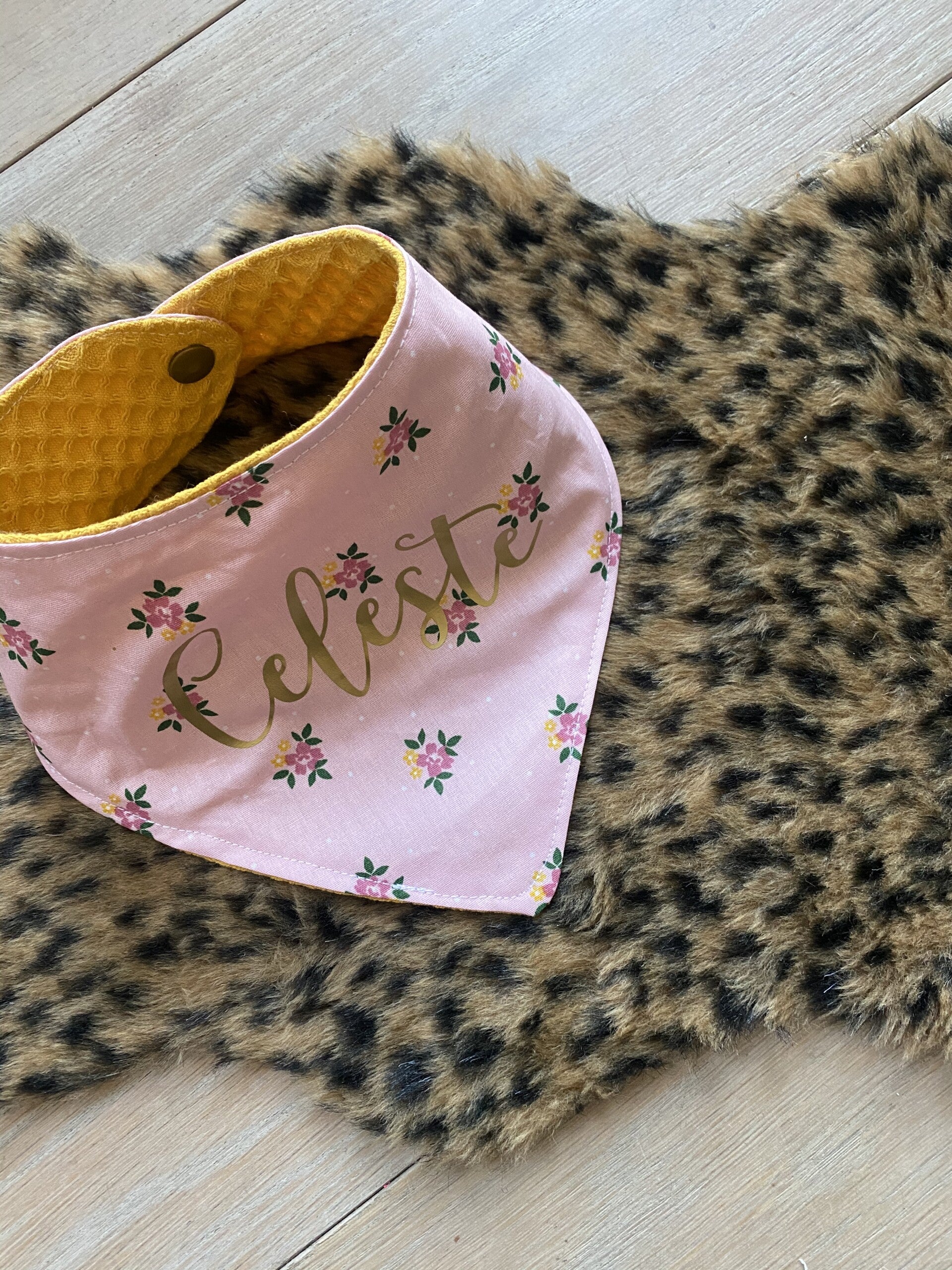Zeversjaaltje met naam. Afgewerkt met drukknopje achteraan zodat het sjaaltje makkelijk aan en uit te doen is. Stofjes kunnen via mail gekozen worden naar eigen smaak.