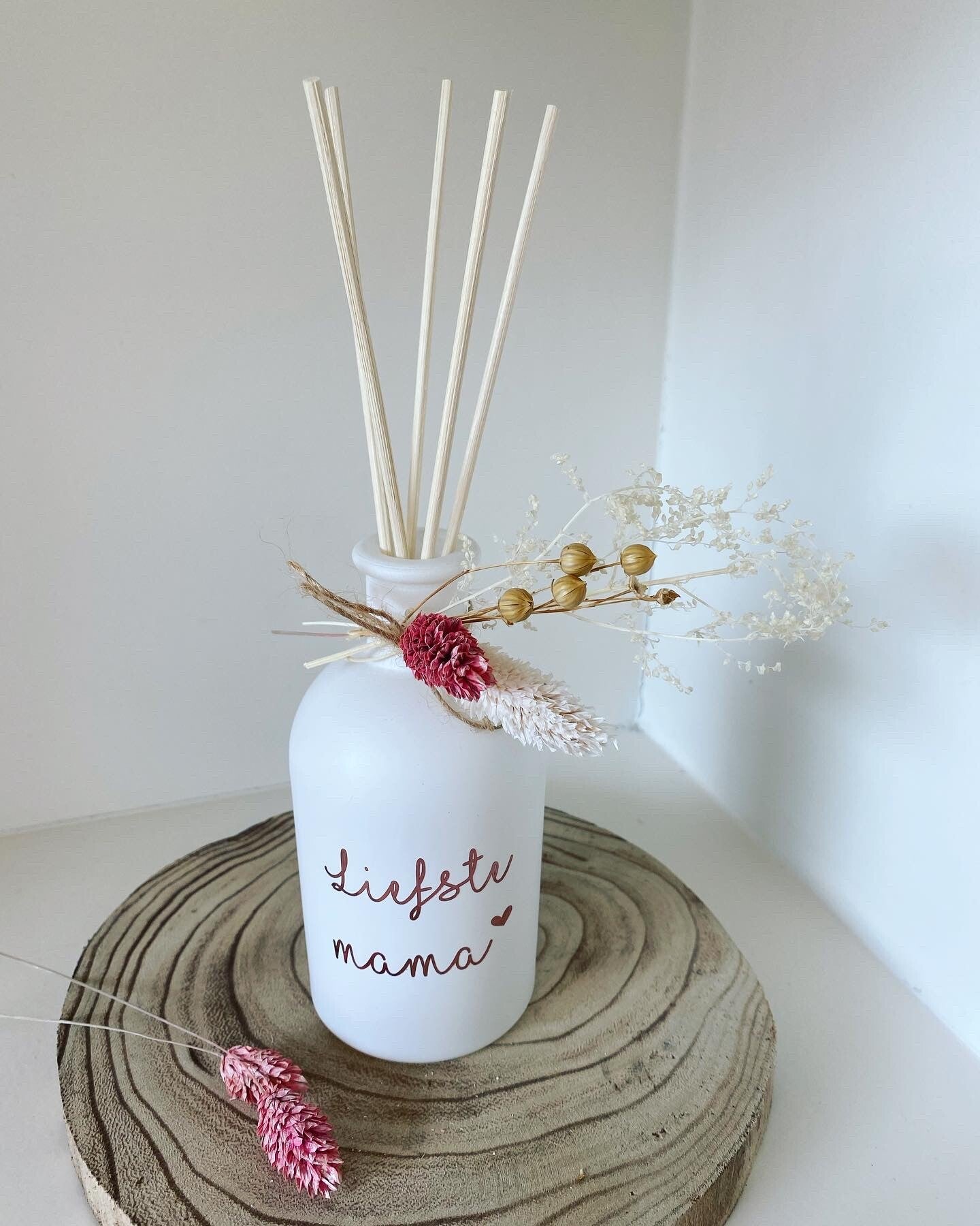 Luxe geurfles gevuld met huisparfum en geurstokjes. Afgewerkt met droogbloemen. inhoud: 250 ml