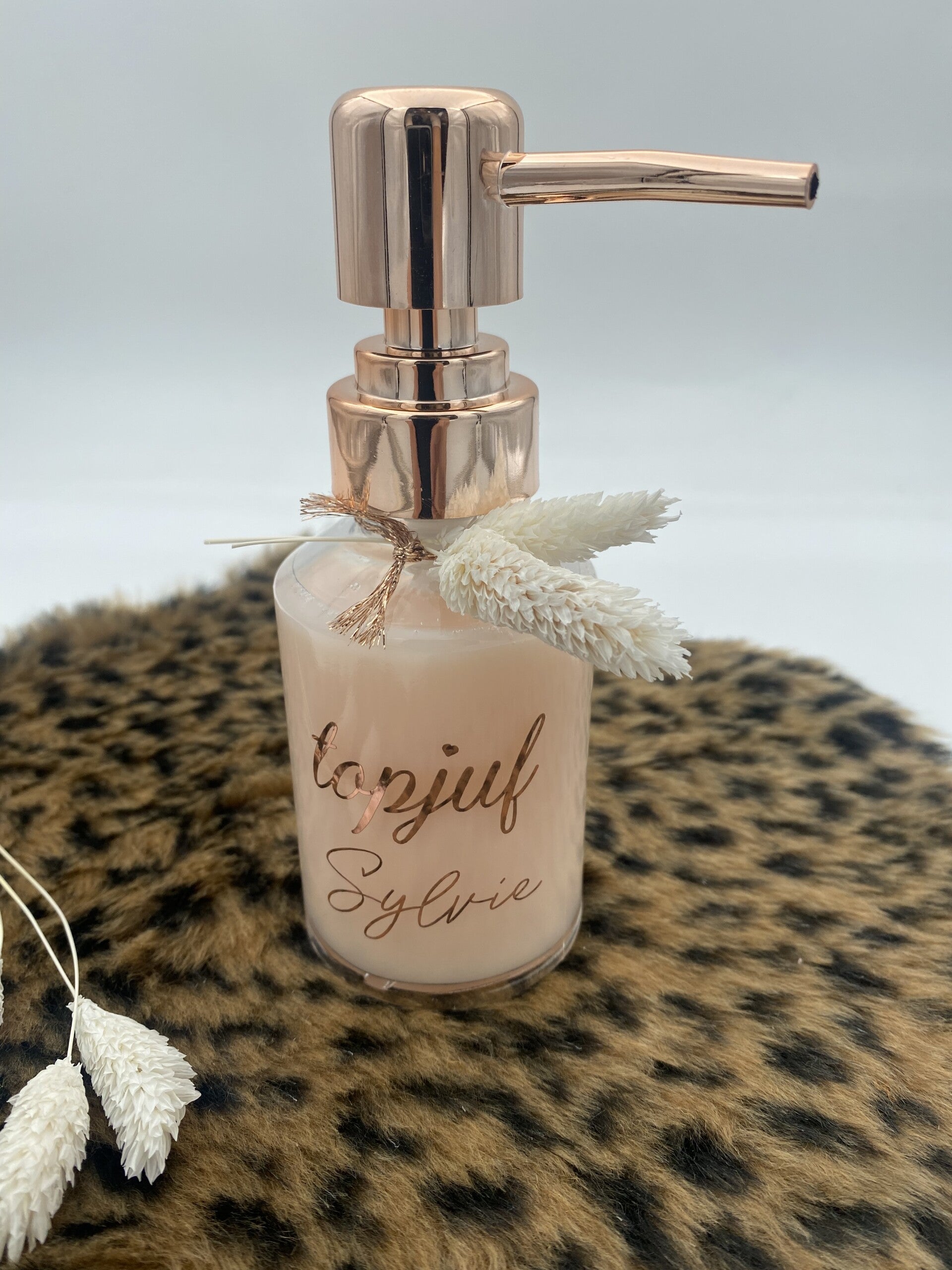Dit flesje heeft een rosé pompje en is gevuld met handzeep, het kleur kan je kiezen.