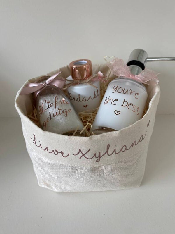 Dit setje bevat een katoenen mandje met daarin verwenproducten.