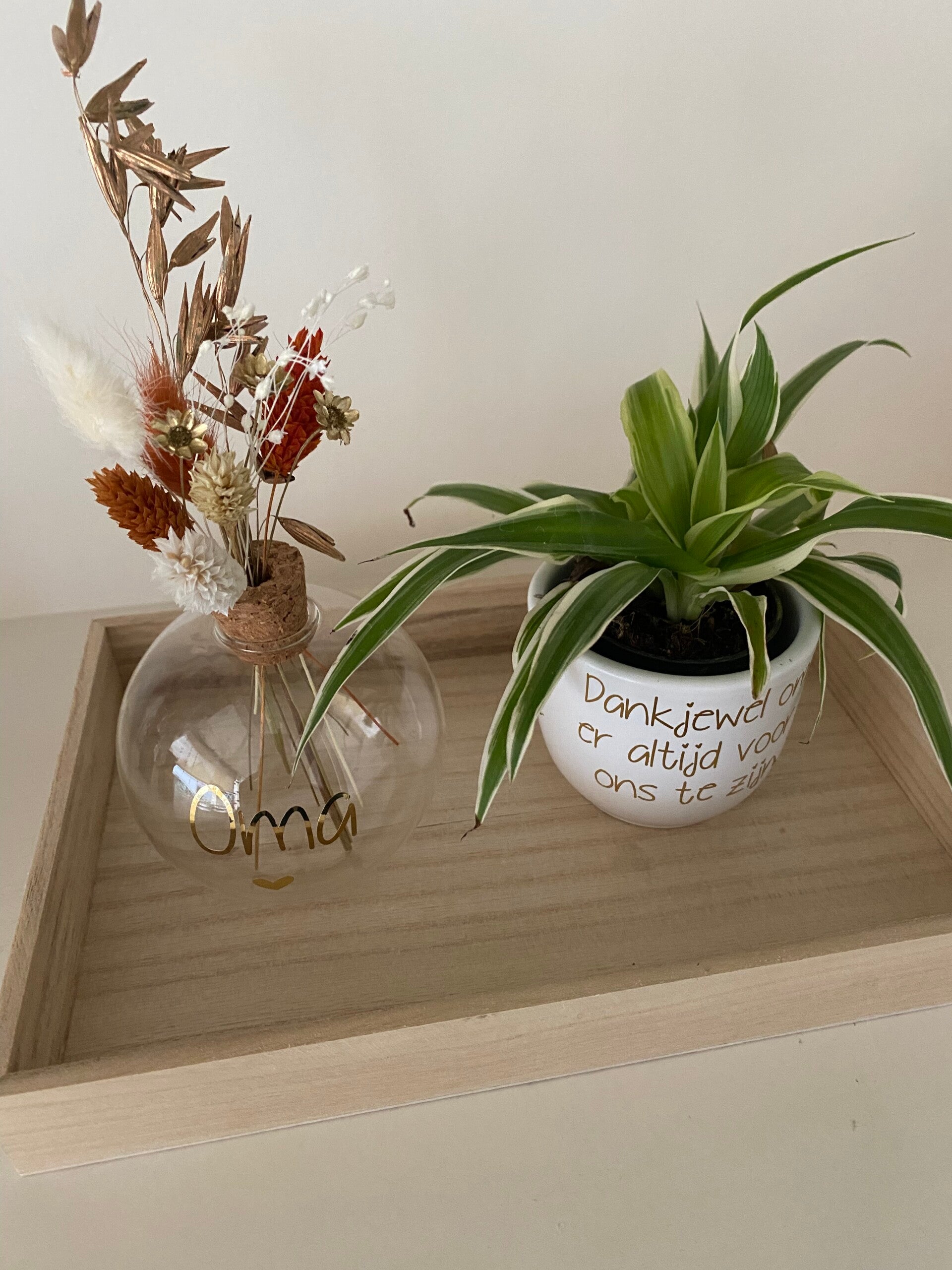 Op het vaasje kan een naam naar keuze gezet worden. Het setje is te bestellen met of zonder houten dienblad.