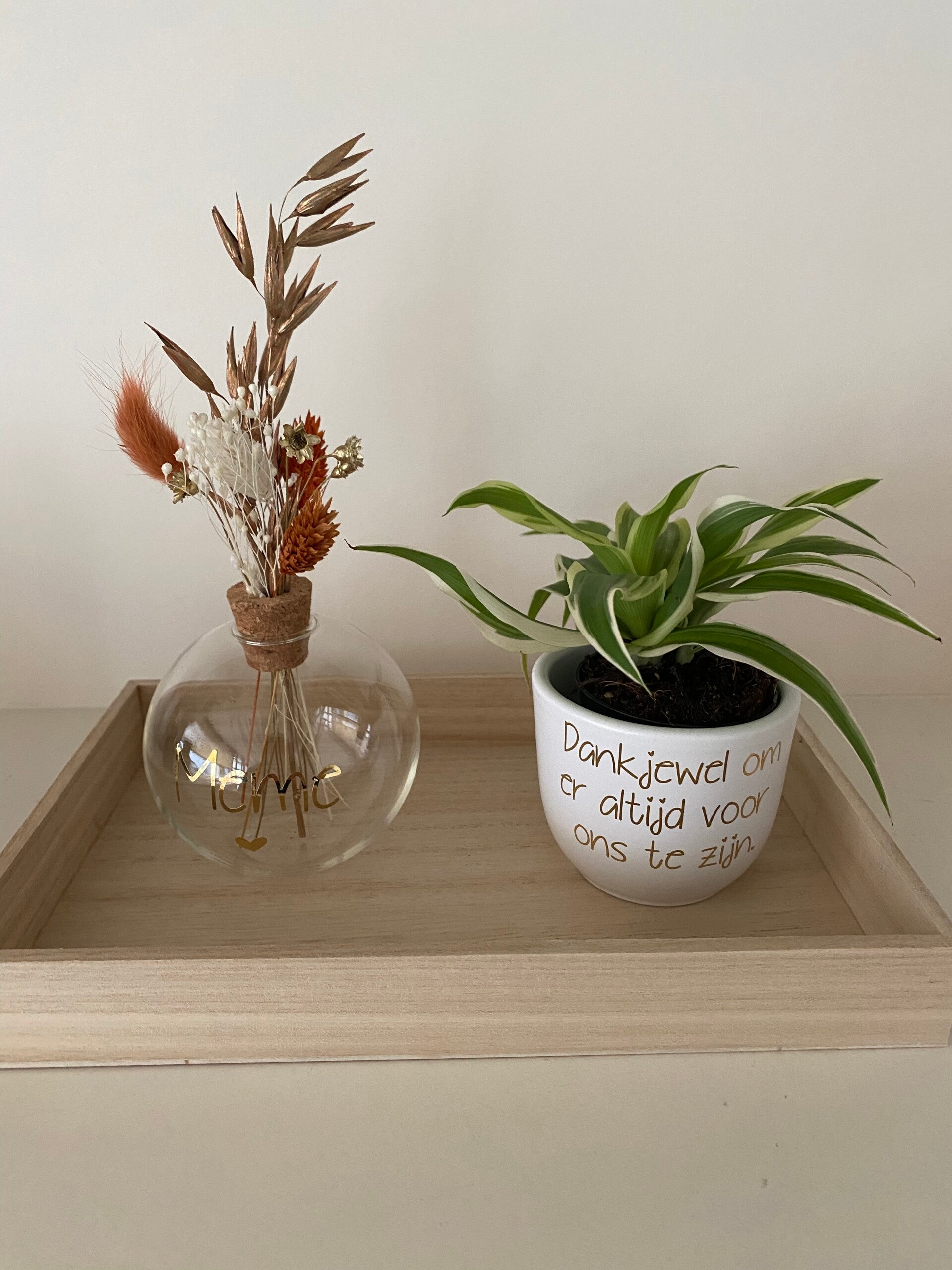 Dit setje bevat een vaasje met droogbloemen, een keramieken potje met plantje met tekst: bedankt dat u mij hielp groeien. Of een andere tekst naar keuze.
