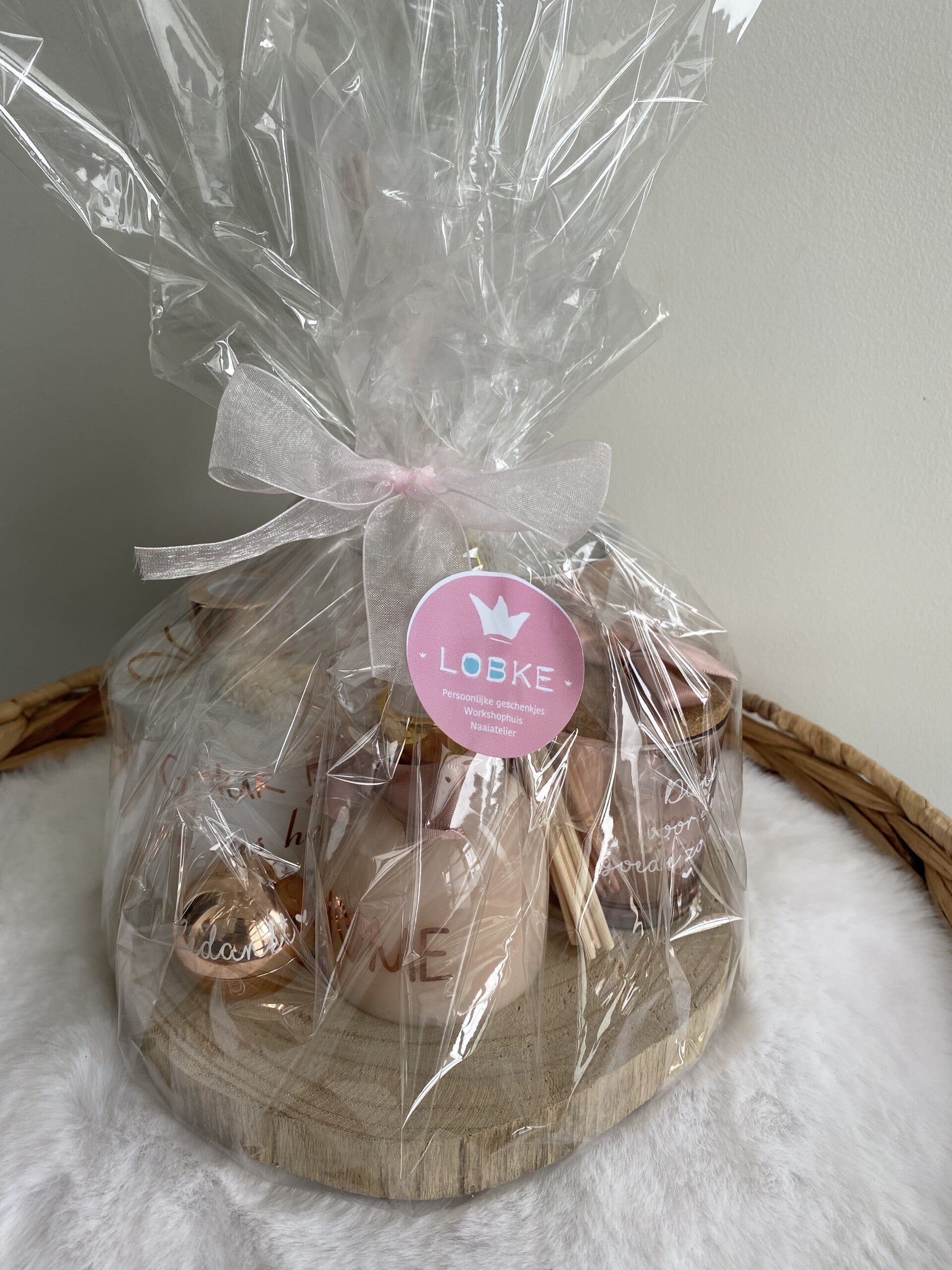 Alles in rosé uitvoering afgewerkt met lint en bloemen.