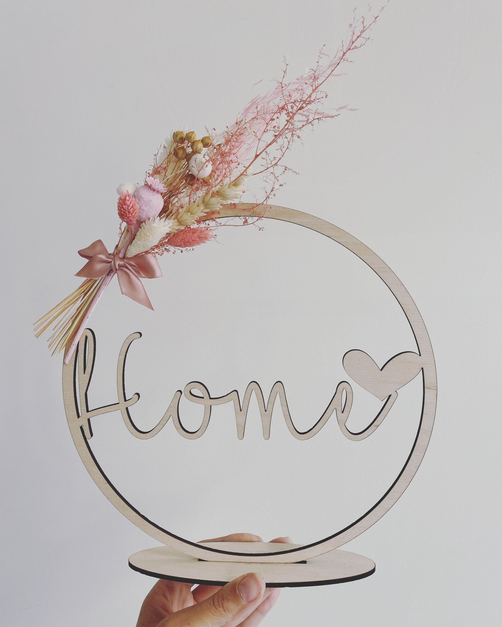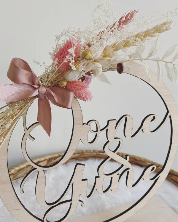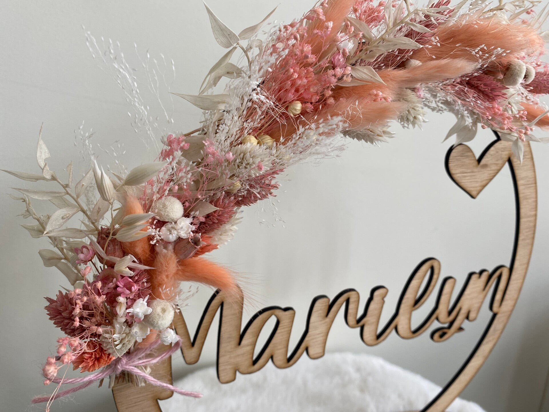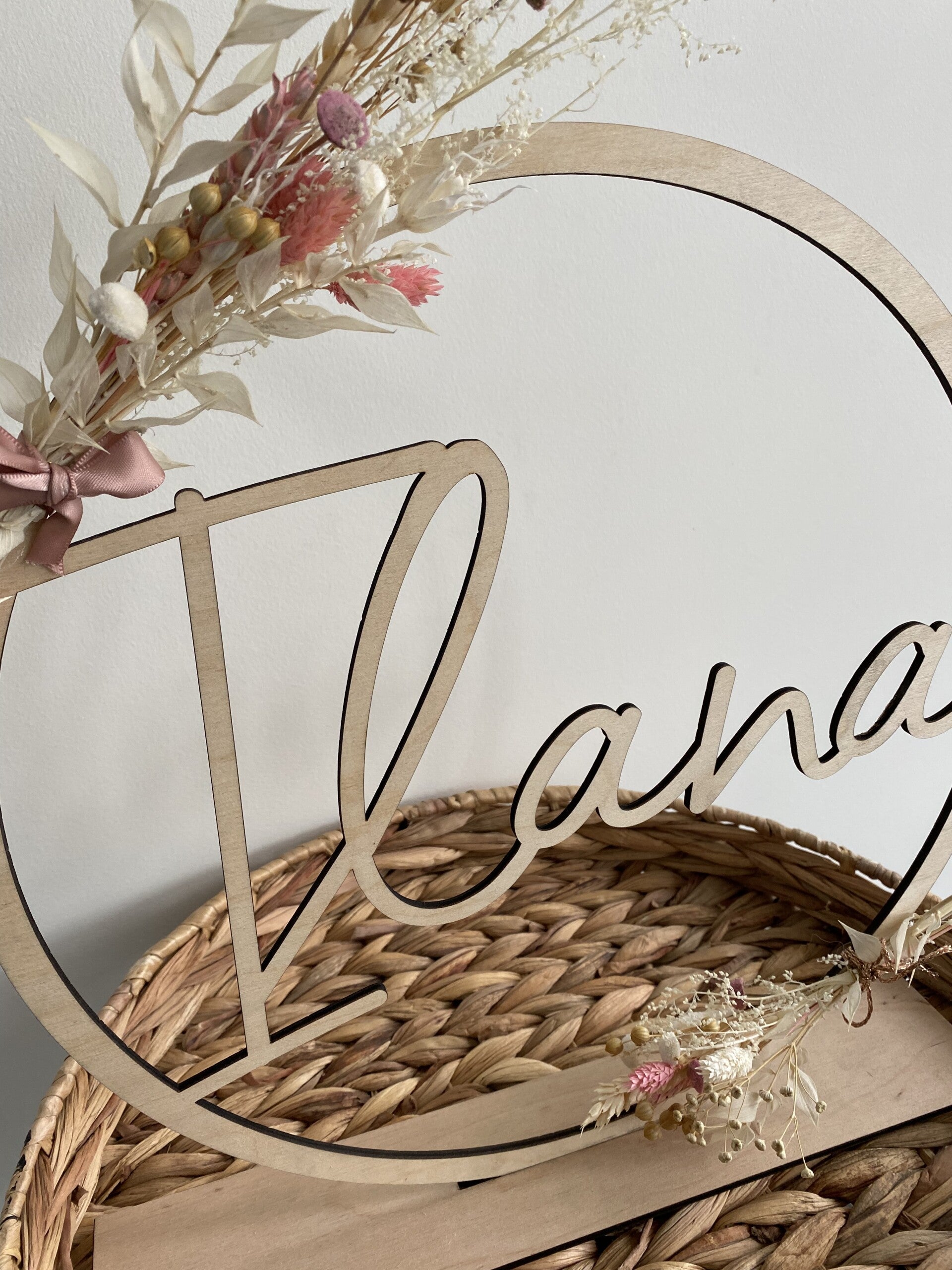 Een gepersonaliseerde naamcirkel op voet voor jouw kinderkamer of als presentatiestuk. Of misschien ken je wel een (toekomstige) mama die hier wel heel blij zou van worden. Het houtsoort is te combineren met verschillende tinten droogbloemen. Geef hier gerust jouw voorkeur door.