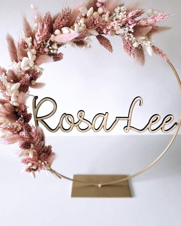 Een metalen hoepel met droogbloemen daar scoor je altijd mee. De hoepel heeft een diameter van 30 cm en wordt afgewerkt met een houten naam.