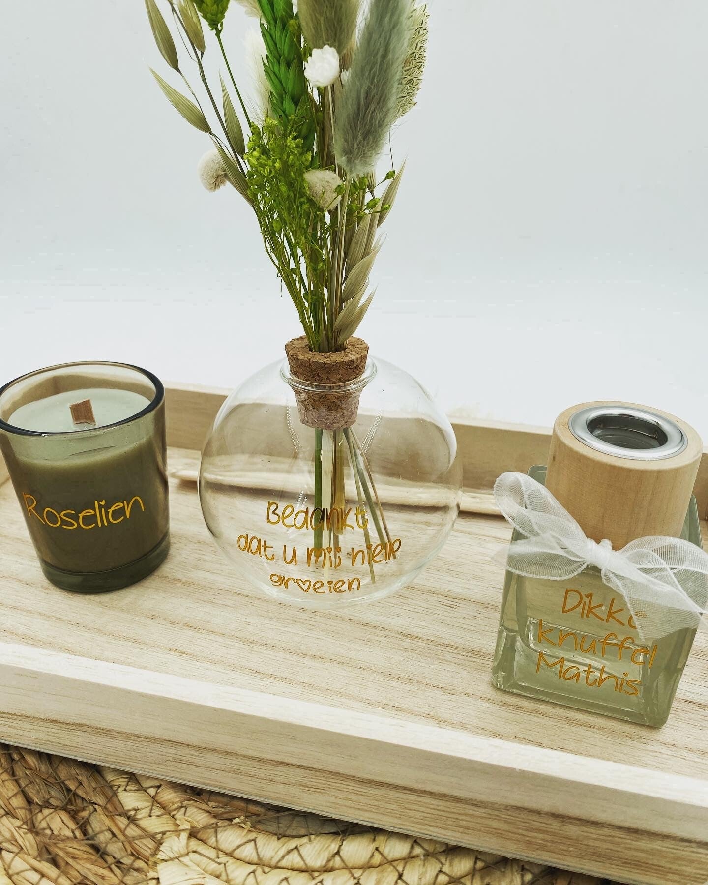 Parfumflesje, vaasje en kaarsje kunnen gepersonaliseerd worden met tekst naar keuze. (Kort)