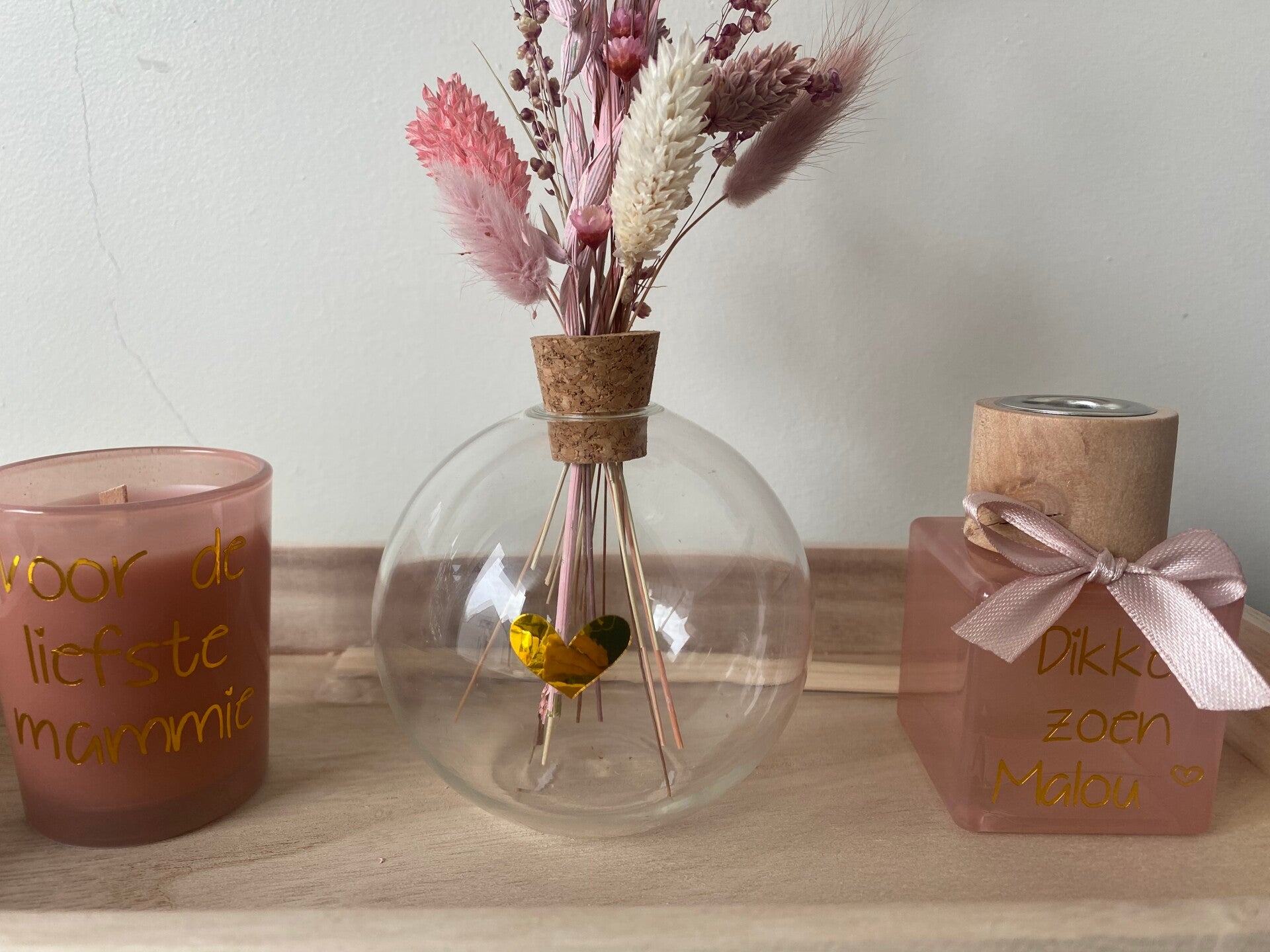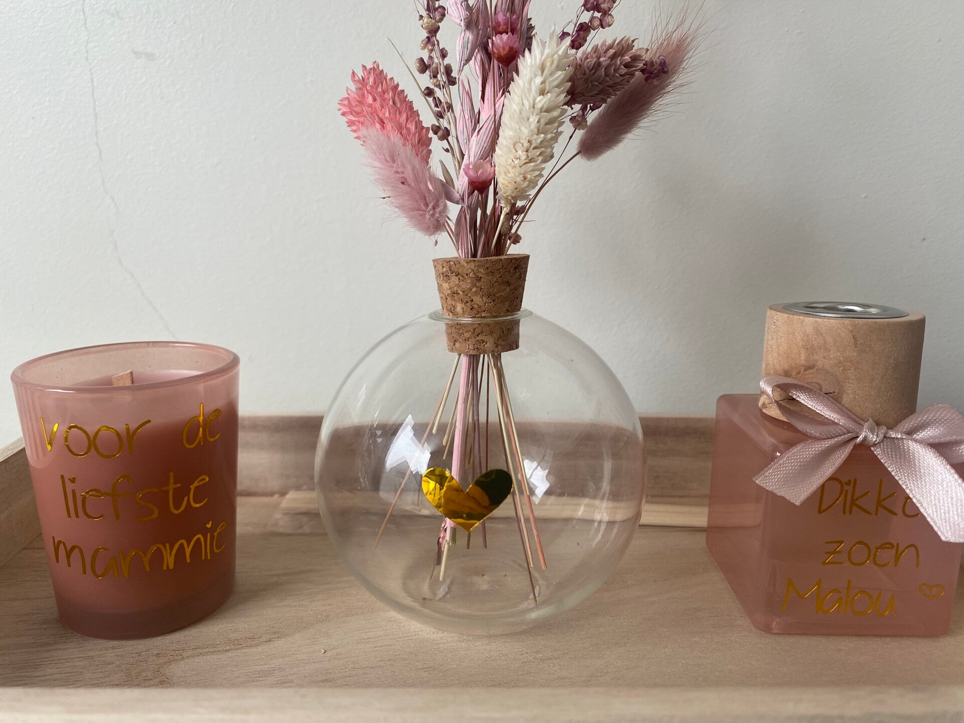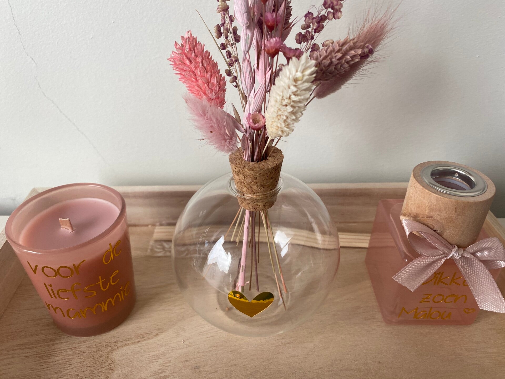 - Bol vorming vaasje gevuld met droogbloemen in kleurtjes passend met het setje.