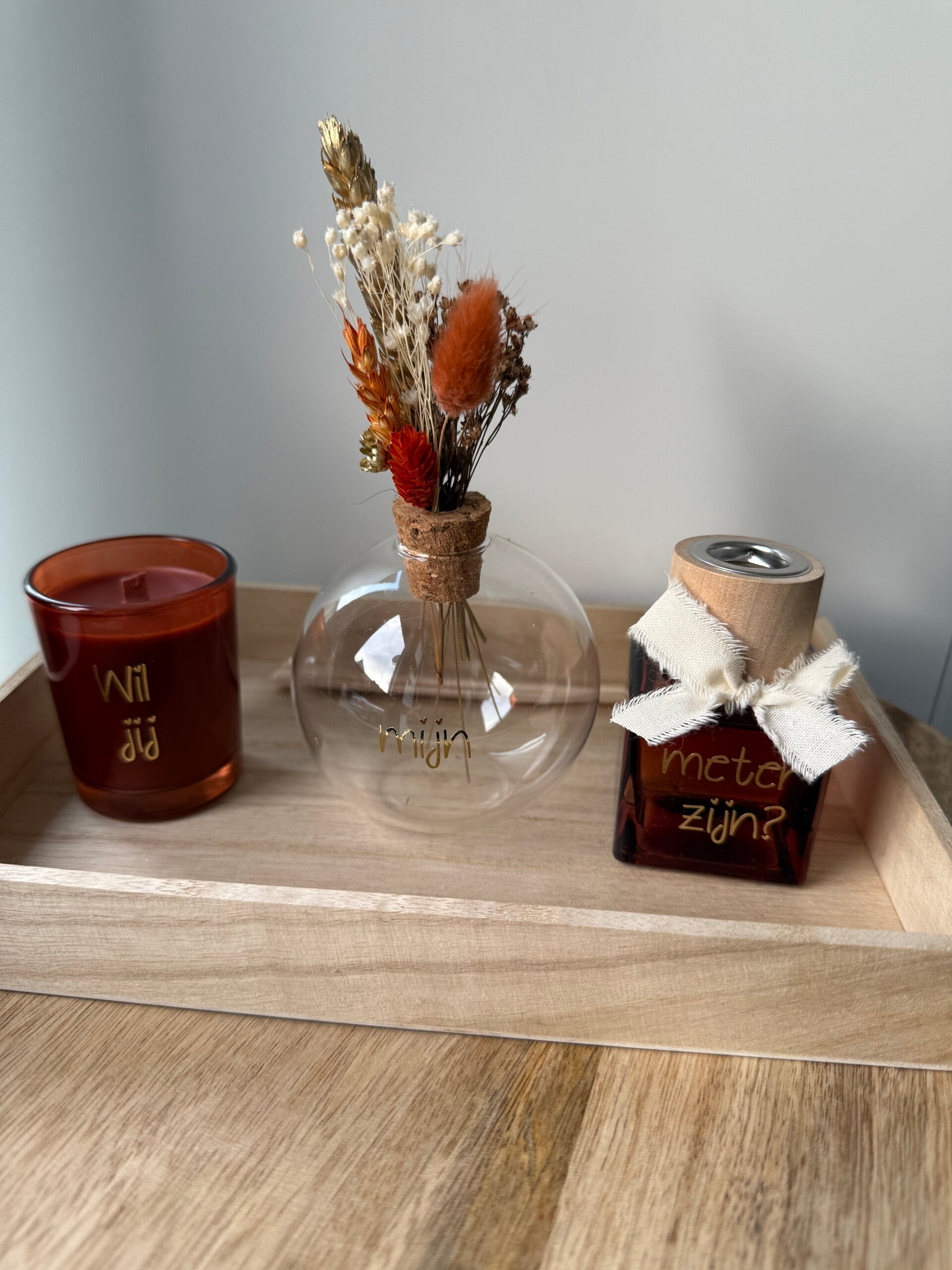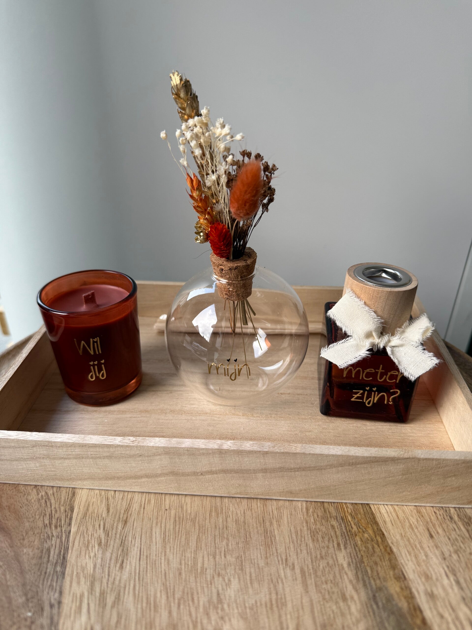 Parfumflesje en kaarsje kunnen gepersonaliseerd worden met tekst naar keuze. (Kort)
