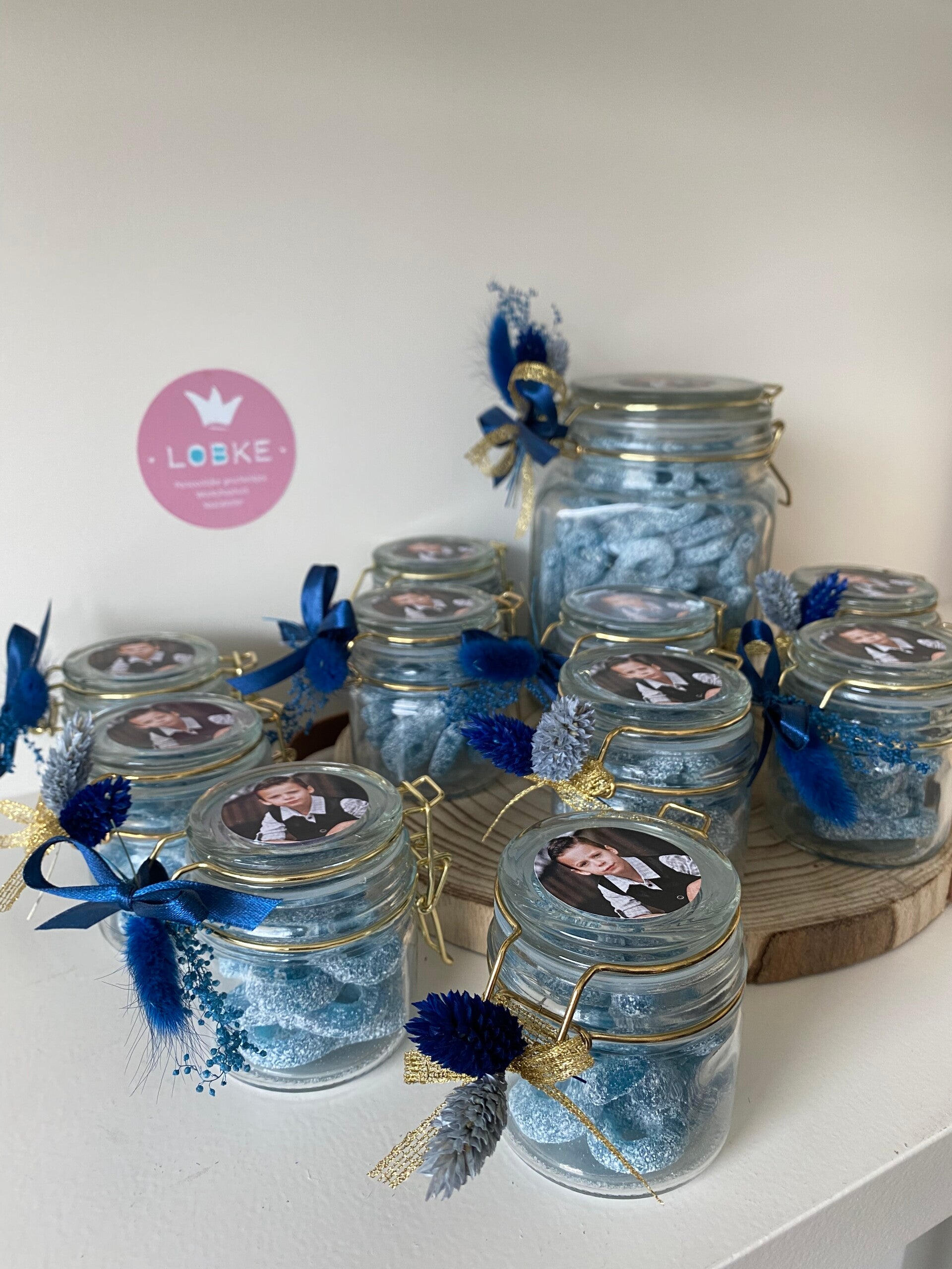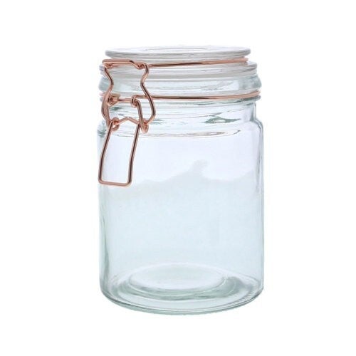 Glazen weckpot met een subtiele, elegante koperen of gouden sluiting, leuk om op te vullen met suikerboontjes, lentilles,...